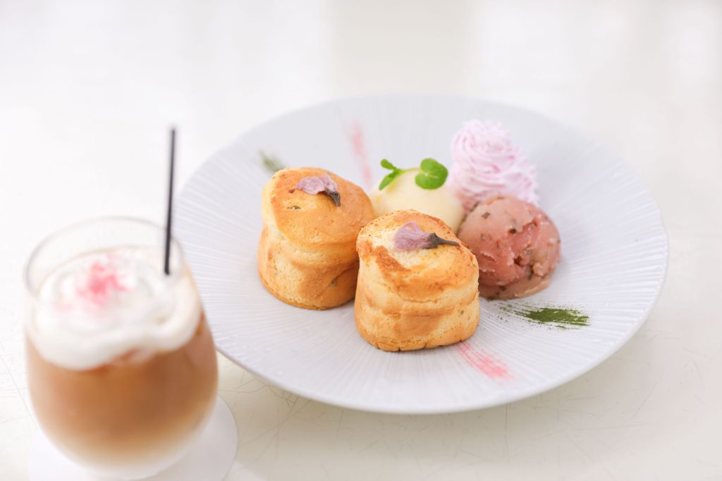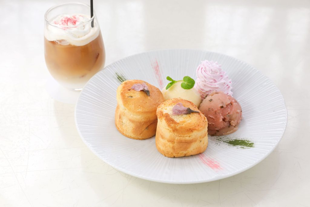 さくら餡を練り込んだ、桜の香りが薄っすら漂うスフレタイプのパンケーキです。桜餡、桜クリームを添えて、食感と風味をお楽しみください!